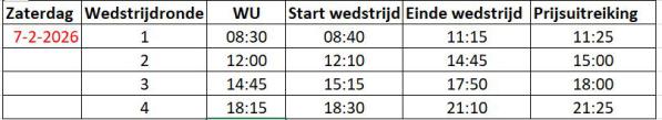 Zoals per mail aangegeven zal de wedstrijd in februari alleen op zaterdag 7 februari plaatsvinden.